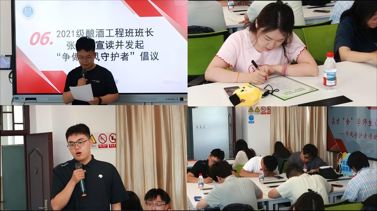 班长张博涵代表毕业生向全院在校生发起“争做学风守护者”倡议。员工代表在承诺书上签名,这既是一份属于食院学子的行动宣言,更是对良好学风的郑重承诺!