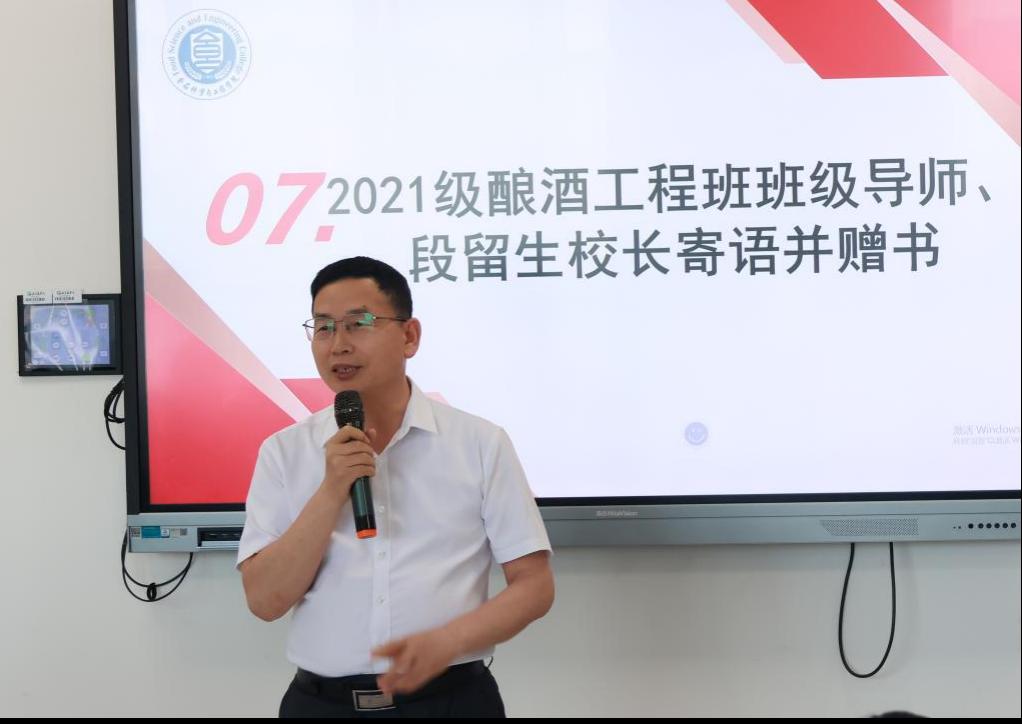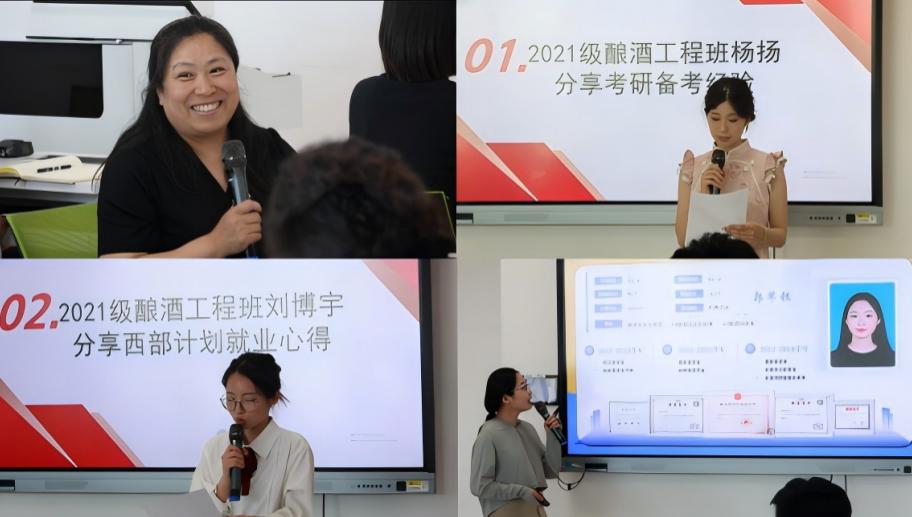 2021级酿酒工程班主任王芳深情回顾了大学四年每一位同学的成长与奋斗以及班级加强学风建设的情况,杨扬同学聚焦“时间管理 + 心态调节”,分享了考研备考的经验。即将奔赴西部的刘博宇同学分享了她“到祖国需要的地方去”的初心,诠释了青年学子的责任担当,彰显了北农学子的奉献精神。国家奖学金获得者、2022级酿酒工程班的郭芊钰同学以“发酵你的时间”为题,结合所学专业,从三段时间酿造法、能量四象限沙漏等方面分享了如何让每一分钟都酿出醇香人生的高效成长秘笈,为低年级员工提供了宝贵经验。