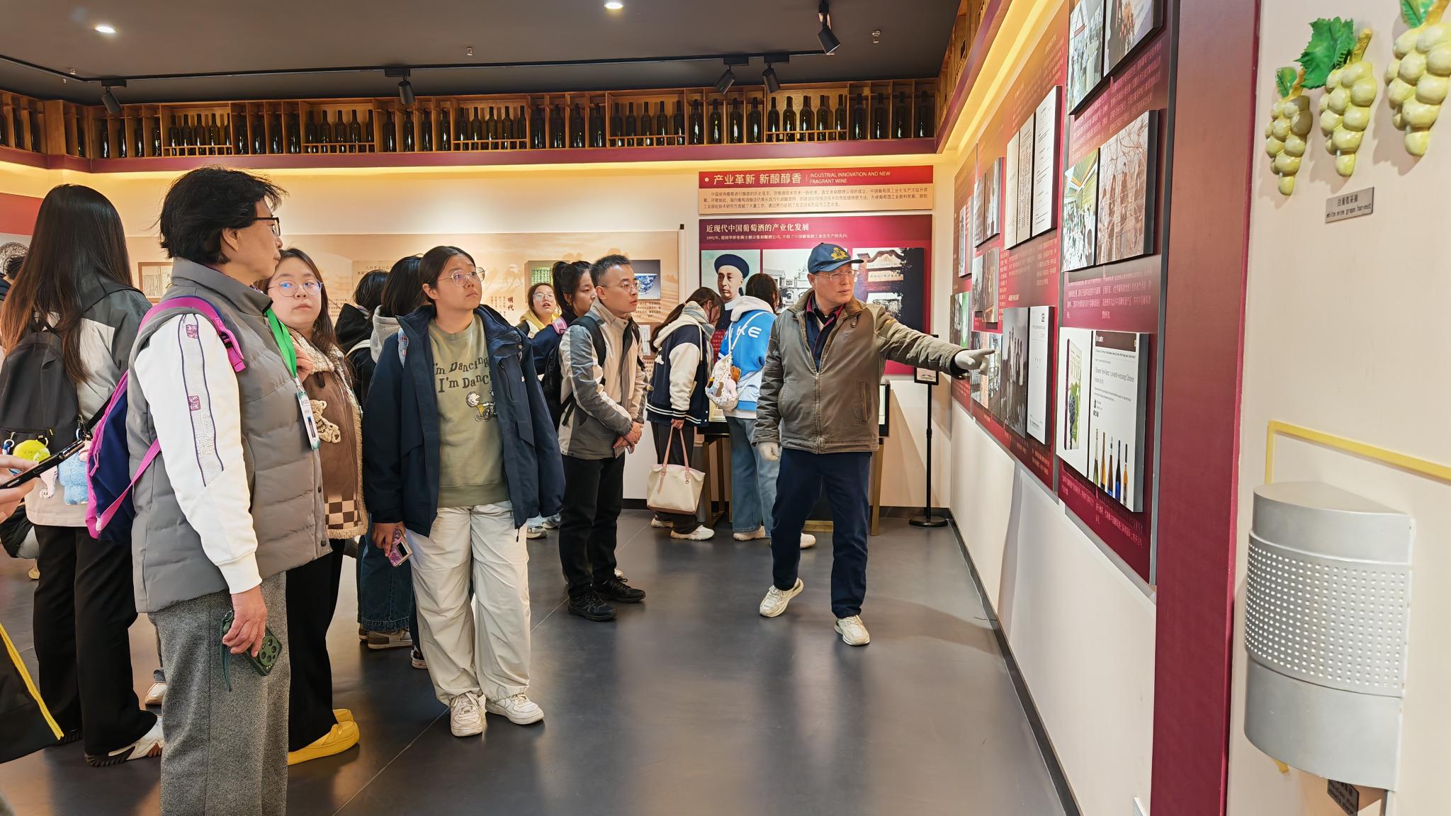午后的莱恩堡酒庄酿酒车间弥漫着葡萄酒发酵的香气,老师带领同学们依次参观除梗破碎区、发酵罐群、储酒车间和灌装线,系统了解葡萄酒酿造全流程。从葡萄采摘后的分选破皮,到酒精发酵的温度控制,再到苹果酸-乳酸发酵的“风味转化”,同学们将课堂上的理论知识与实际生产环节一一对应。在储酒区,橡木桶的“呼吸作用”和“微氧环境对酒体的影响”让同学们感叹:“原来一瓶优质葡萄酒,从田间修剪到车间陈酿,需要如此多的‘匠心守护’。”