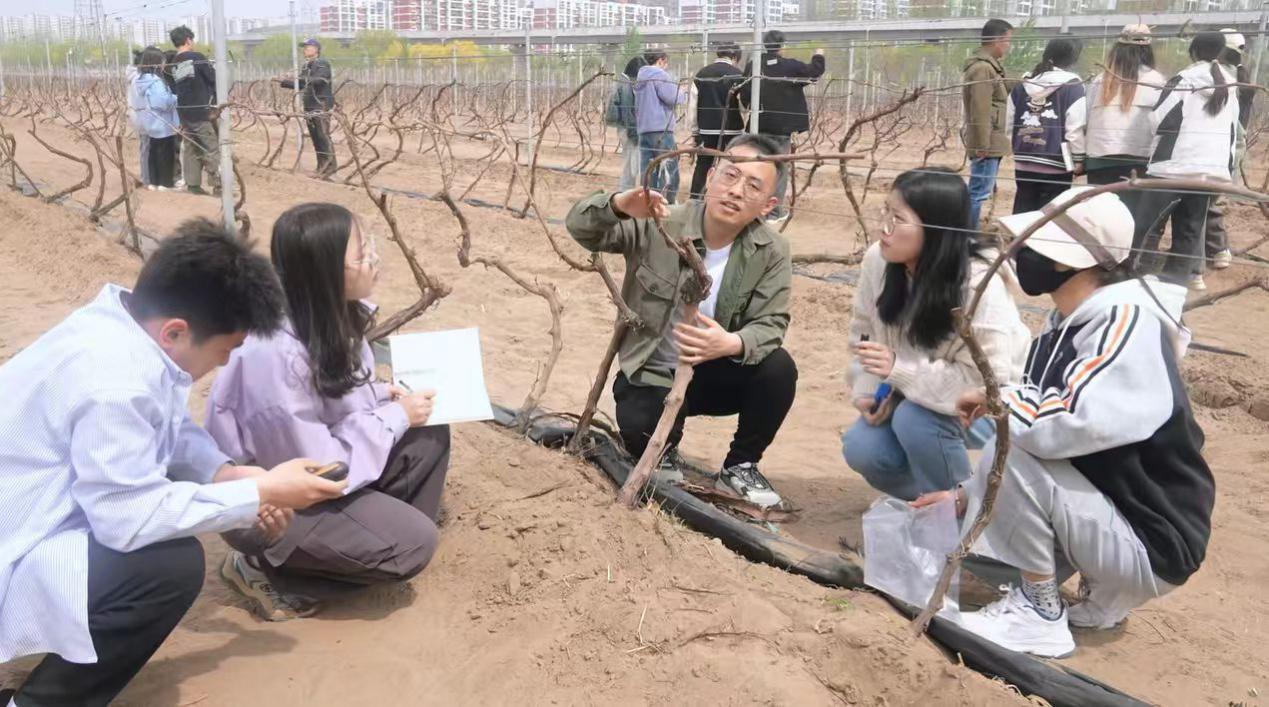 (团队指导教师魏晓峰为团队成员讲解酿酒葡萄种植知识)