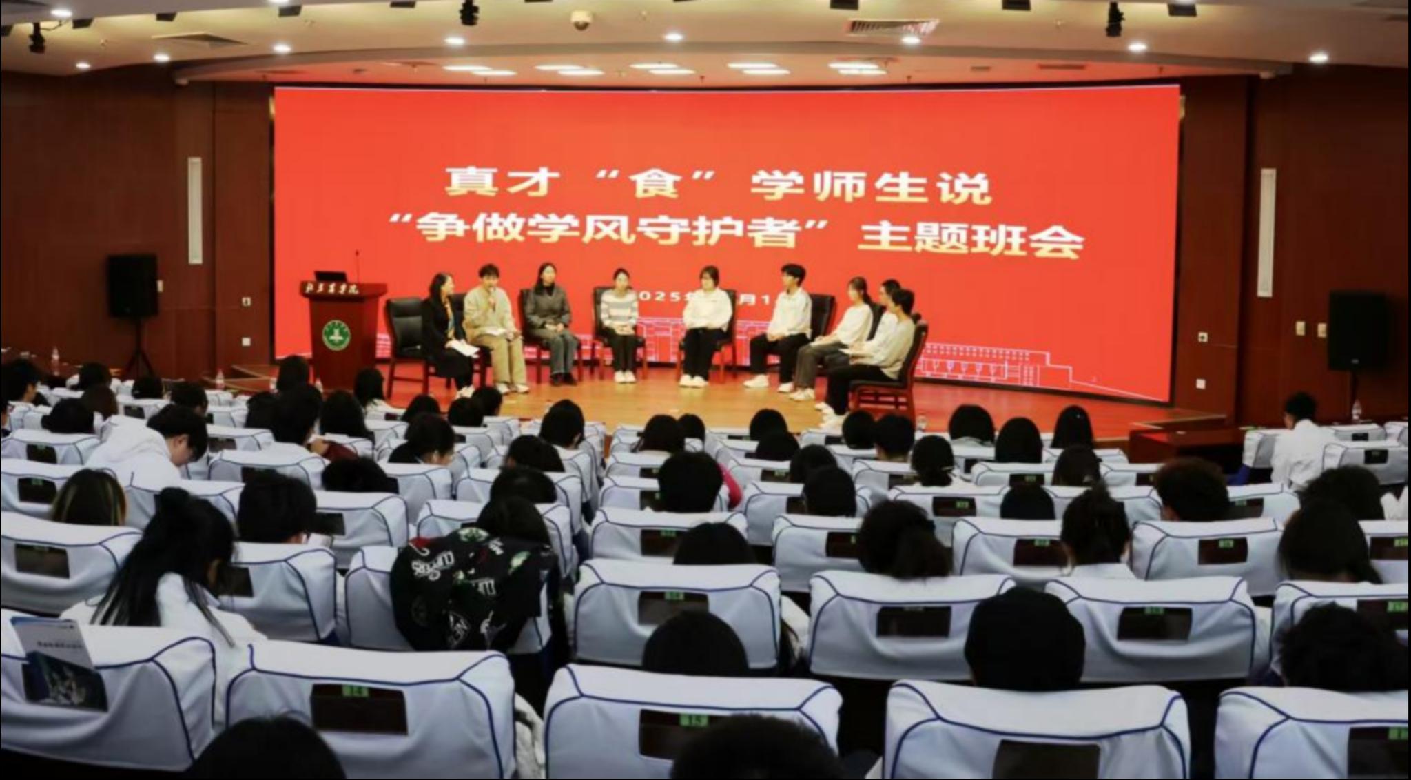 在“真才‘食’学师生说——‘争做学风守护者’主题班会”展示活动中,围绕学院护航、朋辈领航、新生启航,邀请专业教师、班主任、优秀员工代表分别从专业认知、榜样引领、实践养成等多个维度,深入探讨和弘扬优良学风,鼓励大家从自身做起,从每一堂课、每一次实验、每一页笔记做起,争做学风的守护者,为成长成才筑牢根基,为学院和学校的发展贡献青春力量。