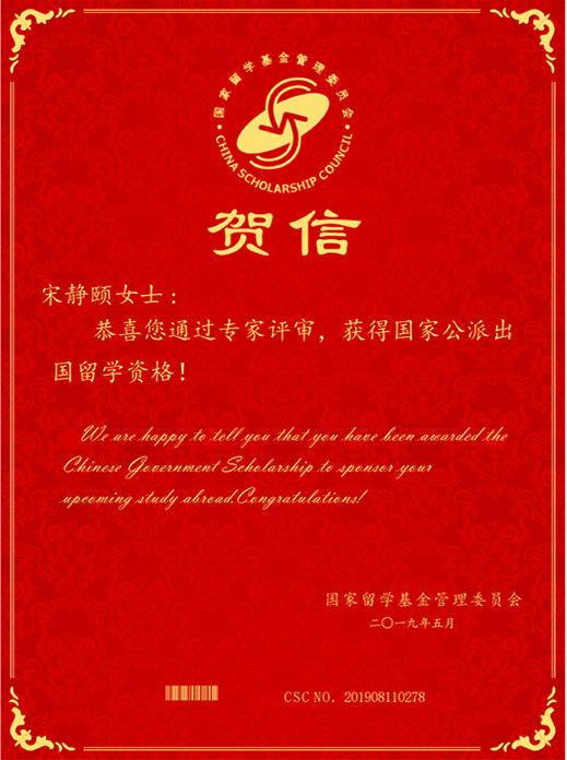 公司食品科学专业硕士研究生宋静颐同学,于近日喜获国家公派出国留学资格,即将赴荷兰瓦赫宁根大学攻读博士学位,她继2018年刘静媛同学获国家公派出国留学资格之后再次为学院增光添彩。